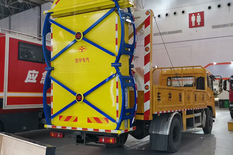 另一款防撞车采用东风天锦新款VR底盘,防撞缓冲模块升降采用液压控制,过程平稳、安全、机械化作业程度高,操作方便,适用于城市道路,郊区道路,高速公路,机场桥涵等场合。用于在发生追尾事故中充当肇事车辆,并且通过自身结构变形吸收撞击能量,最大限度的降低损失和人员或设备发生危险的几率,同时最大限度的降低肇事车辆及人员的危险。